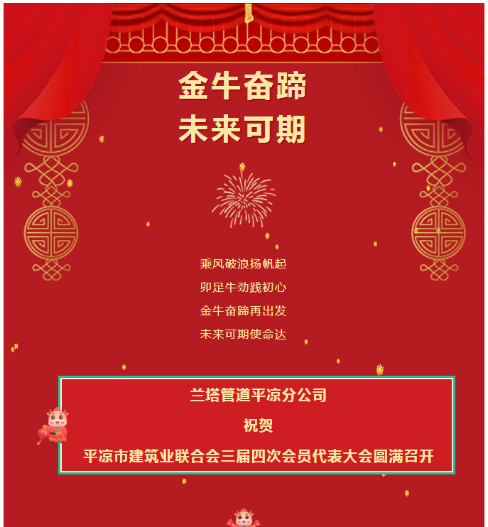 在此,陜西蘭塔管道平?jīng)龇止咀YR平?jīng)鍪薪ㄖI(yè)聯(lián)合會(huì)三屆四次會(huì)員代表大會(huì)圓滿召開(kāi),祝愿所有行業(yè)同仁,2021,牛轉(zhuǎn)乾坤,愿景必達(dá),宏圖大展,再創(chuàng)新高。